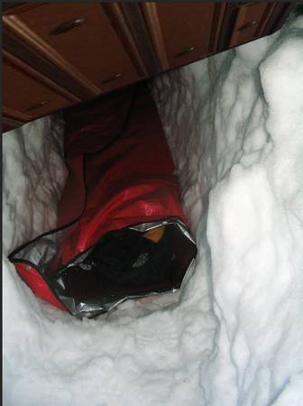 We could tell that another storm system was heading our way of the mountains to the east. So before the storm enveloped us, we quickly constructed a shelter around the dresser and climbed inside. The dresser was not very large at just over 3 ft wide and 3 and half feet tall, The shelter wasn't very spacious, but it certainly got the job done. In the shelter we used the fuel we found to thaw some of the food and water. I don't remember a time that food has ever tasted so good.